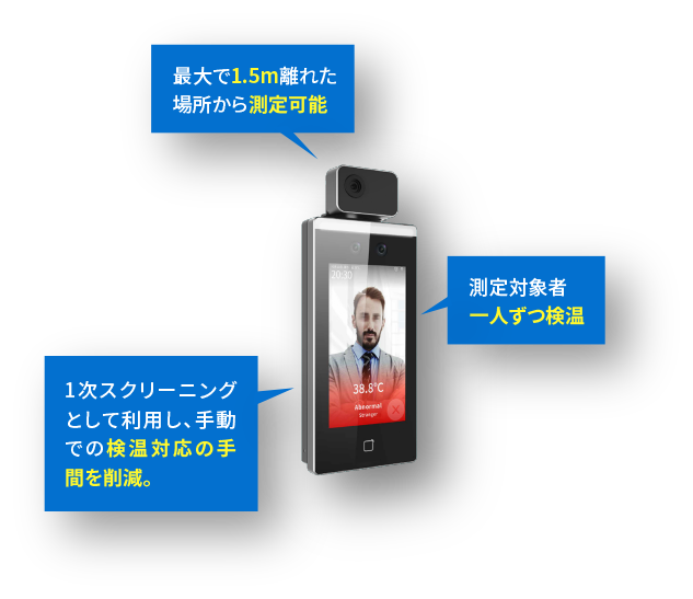 測定時間は約0.2秒と瞬時に測定ができるので、入場者が1人ずつ通過するような動線を設けることで、手軽にソーシャルディスタンスを維持しつつ、スムーズで効率的な体表面温度の測定ができ、従業員の接触リスクを回避します。