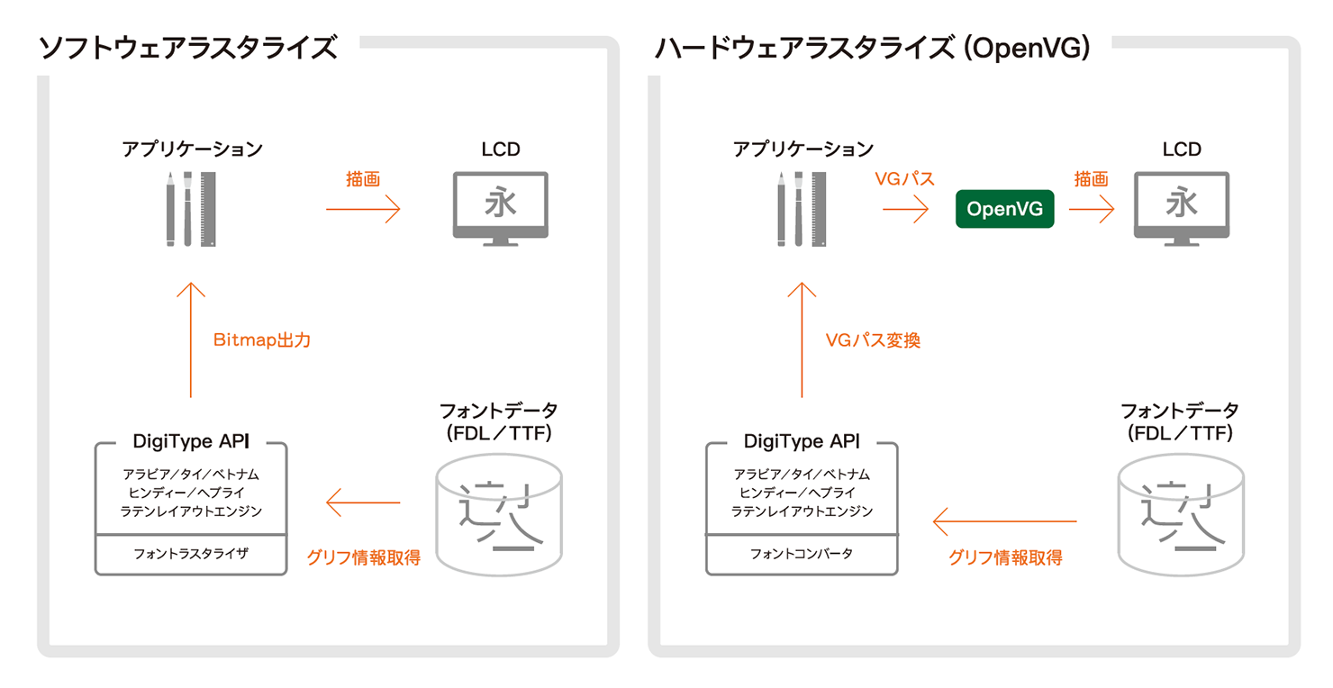 TrueType フォント、DigiType フォント、Bitmap フォント、を組込み開発で利用可能